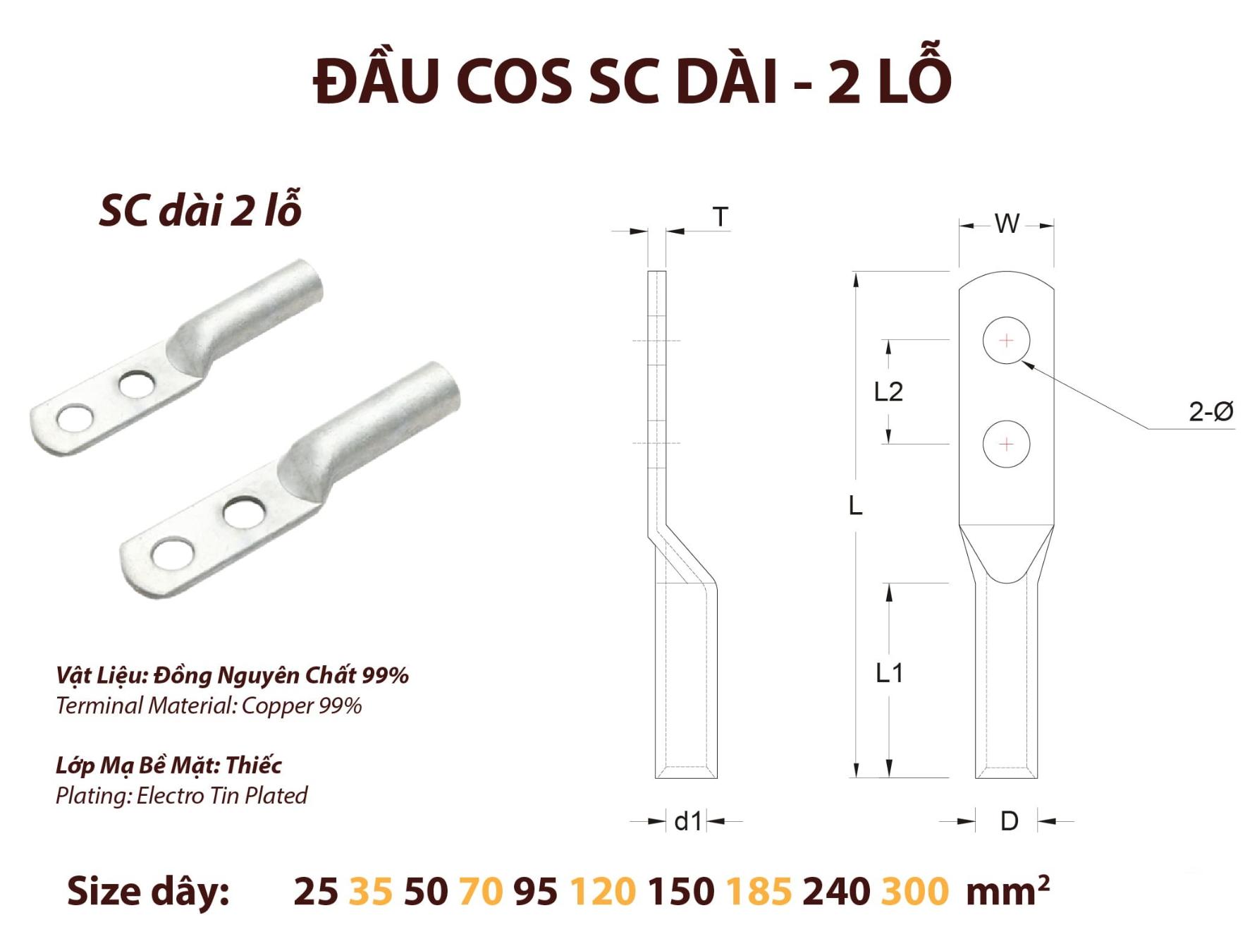 Đầu COS đồng mạ thiếc 2 lỗ (đầu cos SC 2 lỗ) được sử dụng để kết nối cáp và dây dẫn điện với các thiết bị trong hệ thống lưới điện. Sản phẩm được ứng dụng phổ biến trong các hệ thống cơ điện, truyền tải và phân phối điện.